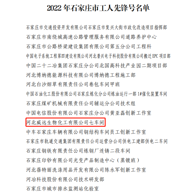 今年一月,石家莊市總工會辦公室下發(fā)《關(guān)于命名 2022 年“石家莊市工人先鋒號”的決定》,威遠生化第七車間在2022年石家莊“工人先鋒號”評選中成功入圍,榮獲“石家莊市工人先鋒號”稱號。